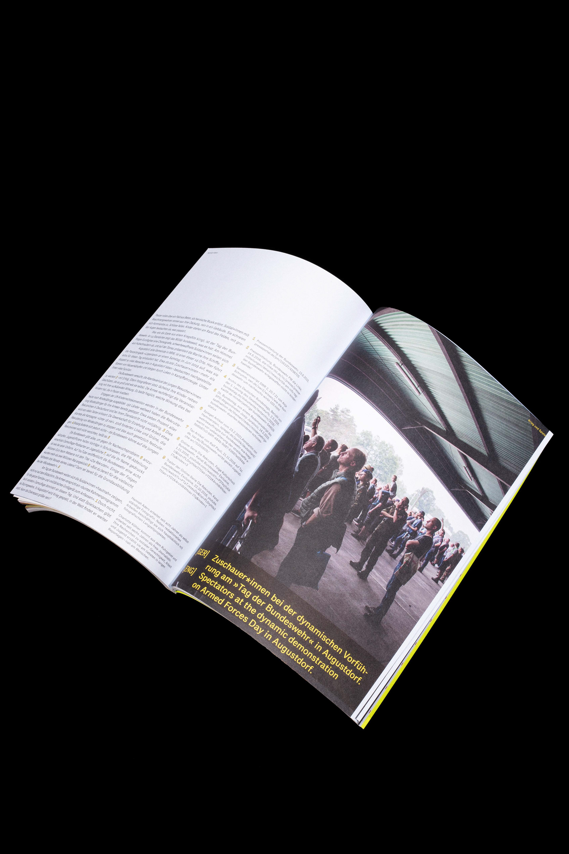 Patrycja Kopinska fürchtet die Zeit und fragt sich, was geschieht, wenn sich der Film des eigenen Lebens wie im Zeitraffer abspielt. Hannah Aders dokumentiert die Begeisterung für Krieg und Waffen am Tag der Bundeswehr. Bennet Diephaus beleuchtet die verheerenden Klischees gegenüber der queeren Community. Innenarchitektin Franziska Innig-Aguion beschäftigt sich mit selbstbestimmtem Sterben, und Fotografin Sabine Findeisen zeigt uns Menschen mit Behinderung, die sich Liebesbeziehungen wünschen. Mit seinen Illustrationen gewährt Jan Skyprzek mutig Einblicke in ein Leben mit psychischen Erkrankungen und täglichen Medikamentendosen, ebenso wie Patrick Krawczyk ein leidenschaftliches, lyrisches Bekenntnis zum Selbst formuliert – voller Schmerz und Hoffnung. In ihrem Online-Magazin für Klimagerechtigkeit fragt Linda Rammes, welche Verantwortung wir als Designer*innen tragen.
