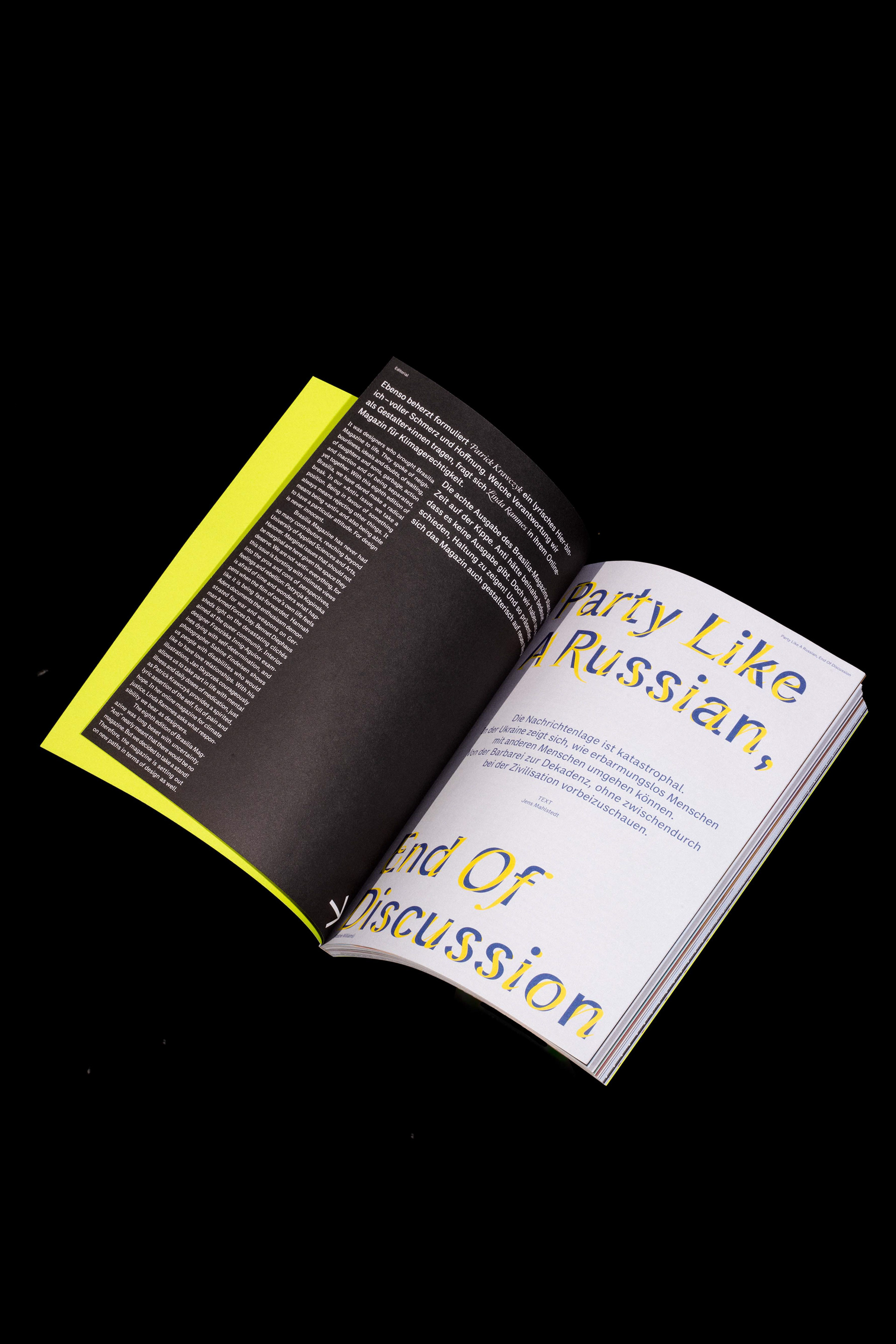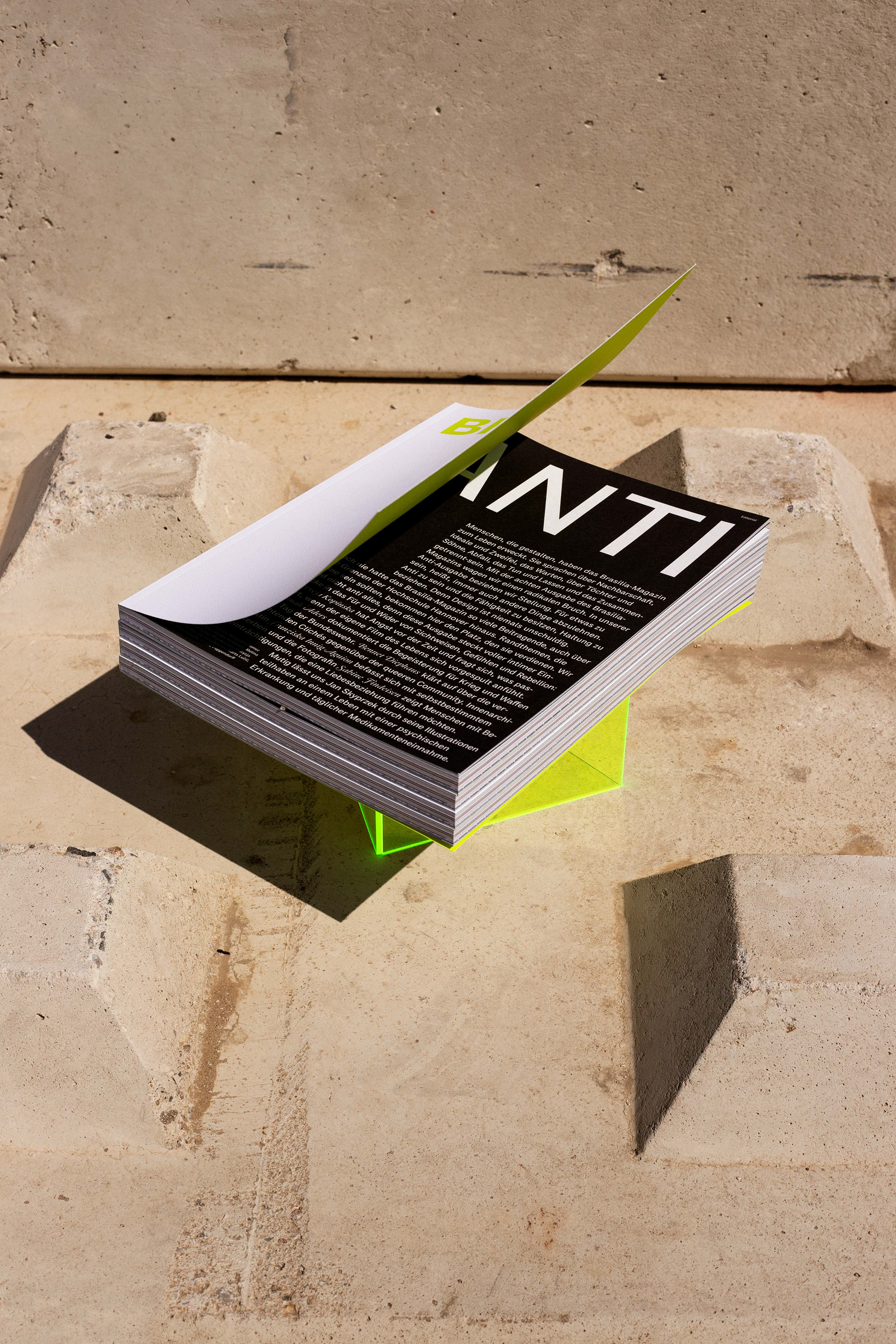 Brasilia Magazine has never had so many contributors, reaching beyond University of Applied Sciences and Arts, Hanover. Marginal issues that should not be marginal are here given the space they deserve. We are not »anti« everything, for this issue is bursting with intimate views into the pros and cons of perspectives, feelings and rebellion: Patrycja Kopinska is afraid of time and wonders what happens when the film of one's own life feels like it is being fast-forwarded. Hannah Aders documents the enthusiasm demonstrated for war and weapons on German Armed Forces Day. Bennet Diephaus sheds light on the devastating clichés aimed at the queer community. Interior designer Franziska Innig-Aguion examines dying with self-determination, and photographer Sabine Findeisen shows us people with disabilities who would like to have love relationships. With his illustrations, Jan Skyprzek courageously allows us to take part in life with mental illness and daily doses of medication, just as Patrick Krawczyk provides a spirited, Iyric assertion of the self, full of pain and hope. In her online magazine for climate justice, Linda Rammes asks what responsibility we bear as designers. The eighth edition of Brasilia Magazine was long beset with uncertainty "Anti" nearly meant that there would be no magazine. But we decided to take a stand!